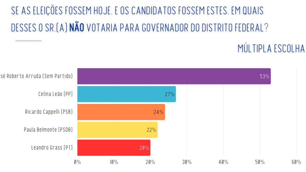 A sondagem, que tem margem de erro de 3 pontos percentuais e nível de confiança de 95%, utilizou modelo de escolha múltipla para medir a rejeição entre os nomes cotados para a disputa. Além de Arruda, aparecem no índice Celina Leão (PP), com 27%; Ricardo Cappelli (PSB), com 24%; Paula Belmonte (PSDB), com 22%; e Leandro Grass (PV), com 20%.