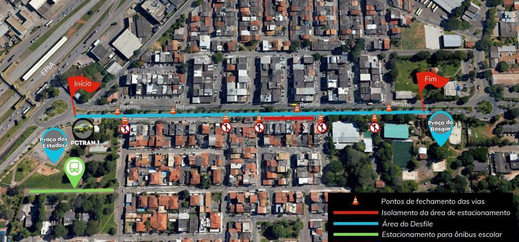 A partir das 8h, a Rua dos Transportes será interditada para o tráfego de veículos. O fechamento ocorrerá entre a Praça dos Estados e a Praça do Bosque. O local será destinado para a realização do desfile cívico-militar, previsto para ocorrer das 9h às 12h. O estacionamento próximo à Praça dos Estados será destinado aos veículos de transporte escolar. Durante o evento, as equipes de fiscalização de trânsito farão o controle do tráfego na região.
