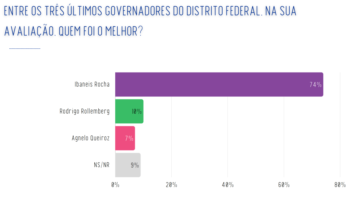O levantamento também mediu a percepção da população sobre os últimos três governadores do DF. Para a maioria dos entrevistados, Ibaneis apresenta desempenho superior ao de Rodrigo Rollemberg (PSB) e Agnelo Queiroz (PT). A pesquisa aponta vantagem expressiva do atual chefe do Executivo quando a comparação é feita de forma direta, reforçando a percepção de continuidade administrativa bem avaliada.