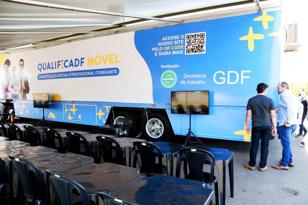 O titular da Sedet, Thales Mendes, detalha a ação: “O QualificaDF Móvel é composto por quatro carretas, unidades móveis, que vão até as localidades onde não há uma sala de aula, não há um espaço físico preparado para ministrar as aulas de qualificação. Estacionamos as carretas e convocamos a comunidade para participar dos cursos. E ali eles ficam por 30 dias aprendendo e se qualificando”.