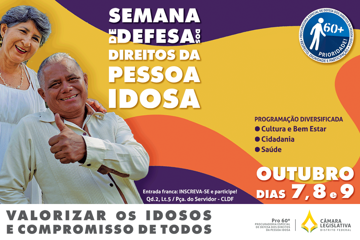 A Câmara Legislativa do Distrito Federal (CLDF) realizará a Semana de Defesa dos Direitos da Pessoa Idosa nos dias 7, 8 e 9 de outubro. O evento, que acontece na área externa e interna da CLDF, oferecerá uma programação extensa e gratuita voltada para o público acima de 60 anos, com serviços de saúde, beleza, emissão de documentos, orientação jurídica e habitacional, além de atividades culturais e educativas. Para participar, basta fazer a inscrição gratuita.