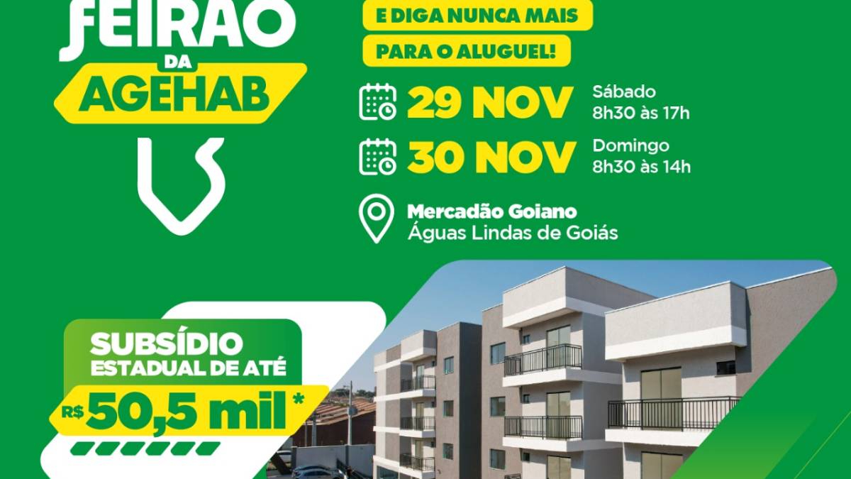 O Governo de Goiás, por meio do Goiás Social e da Agência Goiana de Habitação (Agehab), promove o 1º Feirão da Agehab, nos dias 29 e 30 de novembro. Com estreia em Águas Lindas, a iniciativa reúne em um único espaço, moradores do Entorno do Distrito Federal que buscam acesso à casa própria e se enquadram nos critérios do programa Aluguel Nunca Mais, destinado a famílias com renda de até três salários mínimos.