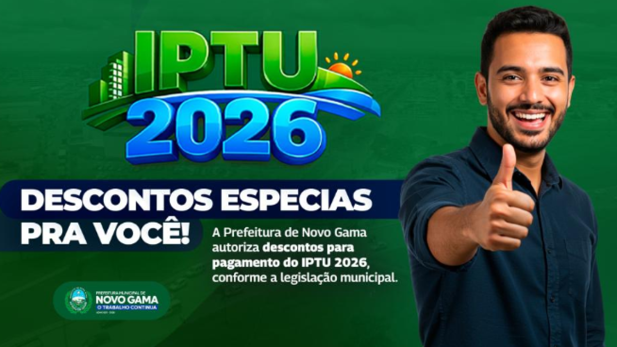 A Prefeitura de Novo Gama informa aos contribuintes que estão autorizados descontos especiais para o pagamento do IPTU referentes ao exercício de 2026, conforme legislação municipal vigente.