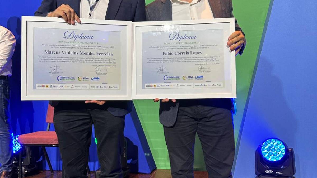 Durante o 7º Encontro Anual de Gestores Municipais 2025, realizado em Goiânia pela Federação Goiana de Municípios (FGM) e pela Associação Goiana de Municípios (AGM), o secretário de Estado do Entorno do Distrito Federal (SEDF-GO), do Governo de Goiás, Pábio Mossoró, recebeu mais uma vez a Insígnia de Honra ao Mérito Municipalista. No mesmo evento, o prefeito de Valparaíso de Goiás, Marcus Vinícius, também foi homenageado com o Prêmio Índice de Gestão pelo Futuro das Cidades 2025, reconhecimento concedido às administrações que se destacam pela qualidade da gestão pública.