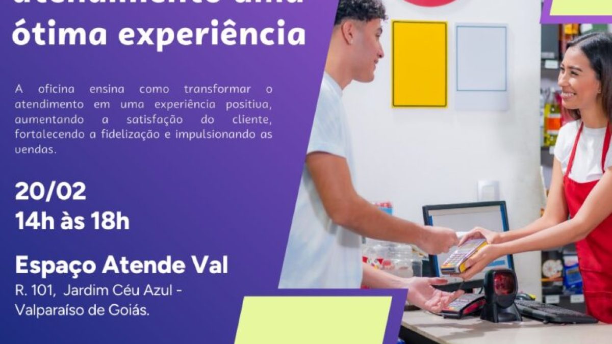 A Prefeitura de Valparaíso de Goiás, em parceria com o Sebrae, divulga a realização da Oficina “Faça do atendimento uma ótima experiência”, que será promovida no município com o objetivo de capacitar empreendedores, gestores e profissionais para aprimorar o atendimento ao cliente e fortalecer seus negócios.